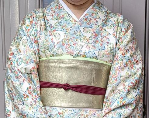 いつ仕立てたのかもわからず。少なくとも50年以上前のお仕立ての正絹かなと思いますが、緑がかった金色の唐草模様のような地模様の帯です。少し地味ですが、着物が華やかな柄なのでちょうど合うかな?と思ってコーディネートしてみました。